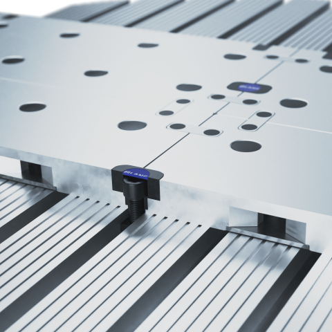 Alignment claws are used for the simultaneous fastening and alignment of Quick•Point® zero point plates lined up next to each other. They can be used when two zero point plates are positioned on the machine table in such a way that they are directly next to each other above a table groove and fastening holes in this area appear to make sense. For this purpose, a corresponding hole must be made across the plate, into which the alignment claw is inserted and fastened with a cylinder head screw countersunk in it and a T-slot nut.